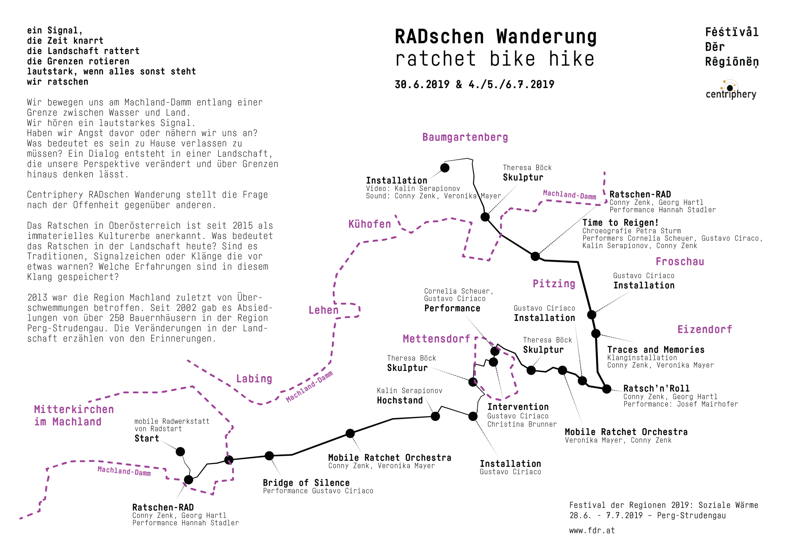 Centriphery invites the audience to an exciting cycling performance, which develops its own perspective on the region and the landscape of the Machland, navigating various locations and landscapes and making them into a stage. The bicycle, wheelchair, and other mobile vehicular devices will simultaneously become actors and instruments. Regional traditions such as “Ratschen”, which is recognized as the immaterial cultural heritage of Upper Austria, will also be part of the performance, as the examination of mobility and the body, confrontations with passersby, and audiovisual art in public space that will be made accessible and experienced by many different people at once. The choreography with which the cyclists will move through the landscape will connect and make the intersections between performance, sound art, media art, and bicycle history dynamic.