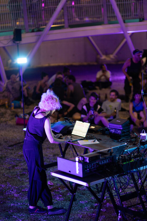 Outside Eye focuses on narratives such as continuity and acceleration through acoustic and visual compositions and live performances. Their main work involves creating a language of improvisation between the body, (digital and physical) spaces and movement-based sound art. Using analog music processing, they create abstract elements such as oscillating pulses and granular flickers, as well as massive drones and stroboscopic bursts. Outside Eye play with the concept of perception and what can be heard in motion. Acoustic experiments in public spaces and participatory performances form the starting point of their artistic practice.