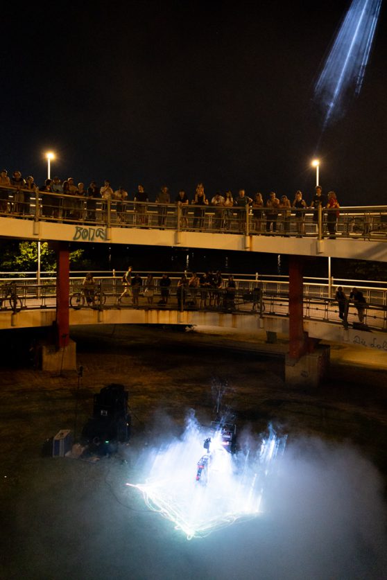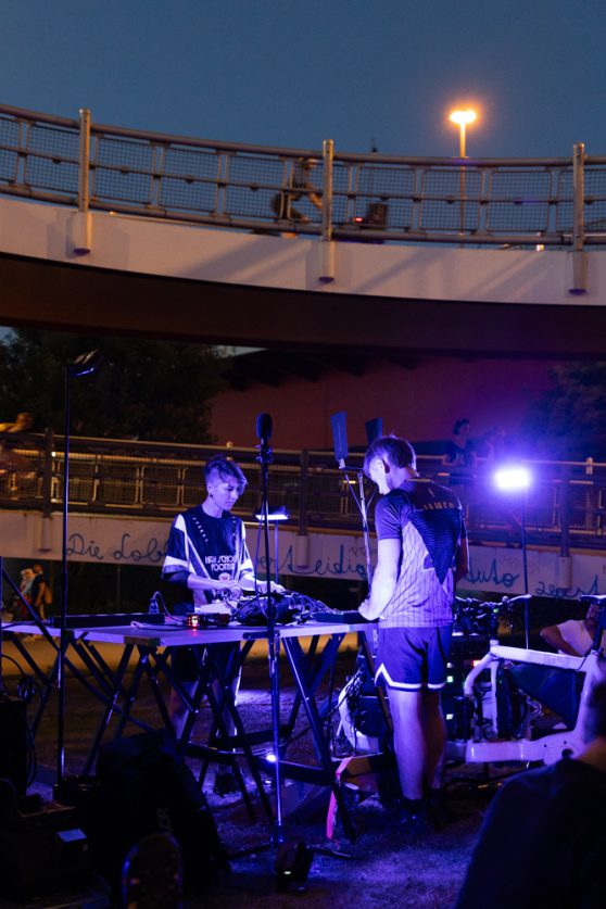 Outside Eye focuses on narratives such as continuity and acceleration through acoustic and visual compositions and live performances. Their main work involves creating a language of improvisation between the body, (digital and physical) spaces and movement-based sound art. Using analog music processing, they create abstract elements such as oscillating pulses and granular flickers, as well as massive drones and stroboscopic bursts. Outside Eye play with the concept of perception and what can be heard in motion. Acoustic experiments in public spaces and participatory performances form the starting point of their artistic practice.