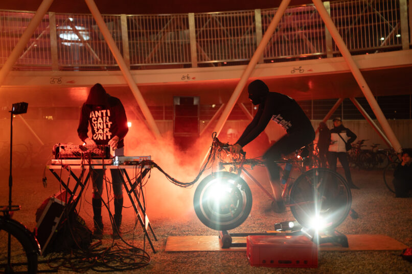 Hypercycle ist eine immersive audiovisuelle Fahrradperformance, die Noise, Tekkno, Klangkunst, Mindmachines und DIY verschmelzen lässt.