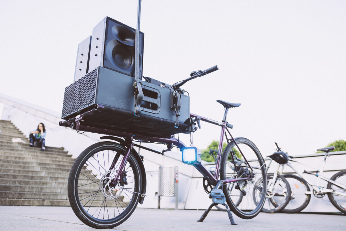 VELODROME is a performance of electronic music that rotates and circles the audience. The bicycle is a vehicle, instrument, and actor at the same time.
