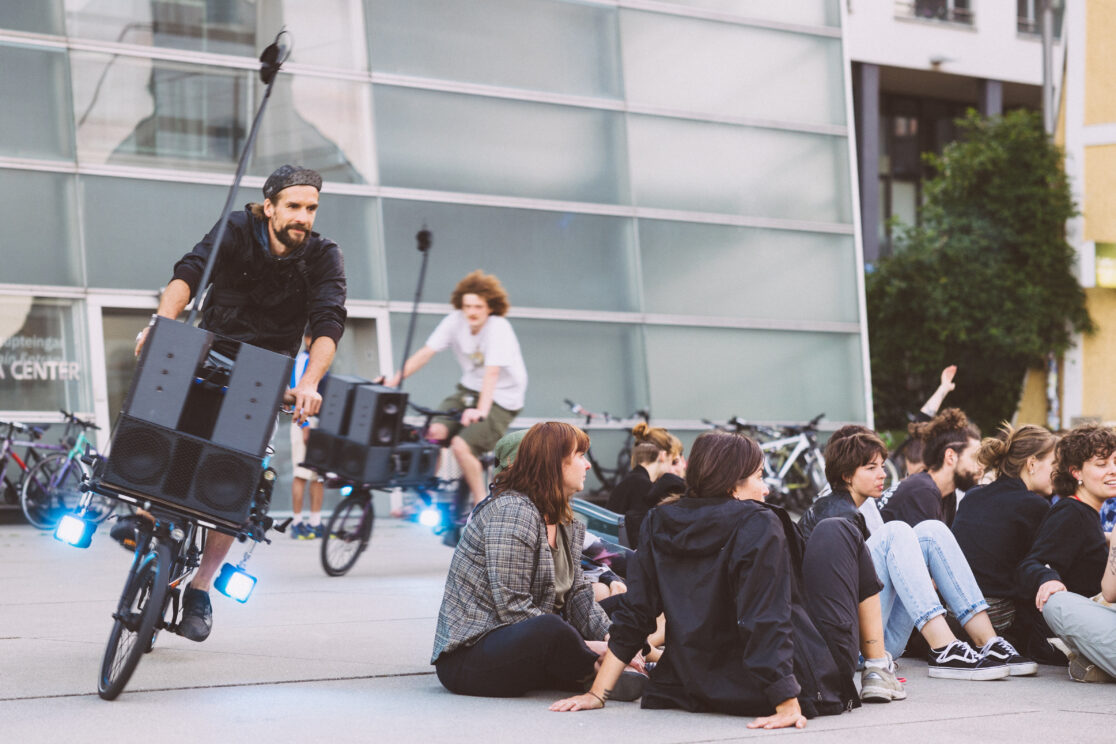 Als VELODROME rotiert elektronische Musik und umkreist das Publikum. Das Fahrrad ist Vehikel, Instrument und Akteur zugleich. VELODROME untersucht elektronische und experimentelle Musik im Sinne von Geschwindigkeit, Tempo und Bewegung und schafft ein mehrkanaliges Klangerlebnis. Das relationale Spiel mit Körpern, Formationen, Rädern und Musik ergibt eine eigene visuell-akustische Choreographie. An der Schnittstelle zu Performance und Sound Art wird das Fahrrad zum künstlerischen Medium. Können Methoden der Klangbearbeitung auf das Fahrrad bzw. die Bewegung übertragen werden? Akustische und räumliche Erfahrungen entstehen durch die chorische Bewegung von Performerinnen und Sound am Fahrrad. Es handelt sich um eine fahrende Klangperformance, die sich durch die wechselnden Positionen der Radfahrerinnen und Lautsprecher akustisch und visuell ständig im Raum verändert und diesen dynamisch integriert.