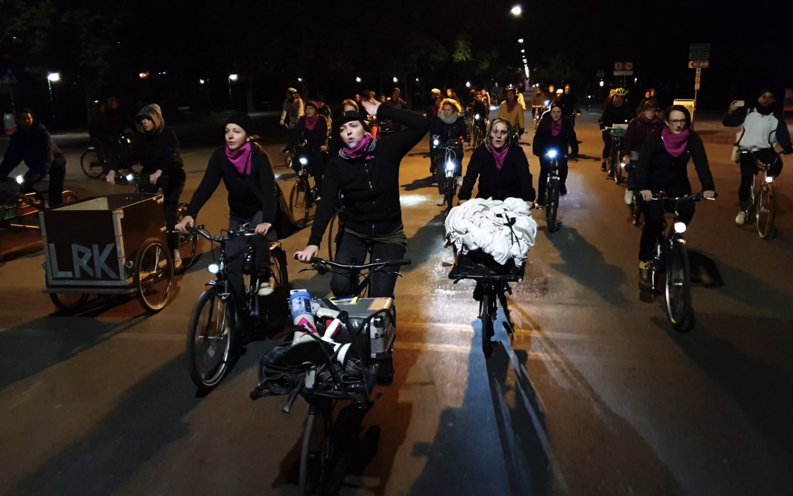 Die gemeinsame Performance und rituelle Durchführung schafft einen temporären und mobilen feministischen Safe Space. Wir sind LAUT UND SICHTBAR im BITCH*RIDE. Das WITCH*BIKE manifestiert sich dabei als unser Symbol des Widerstands gegen repressive Auswirkungen des Kapitalismus und Patriarchats auf unsere Körper.